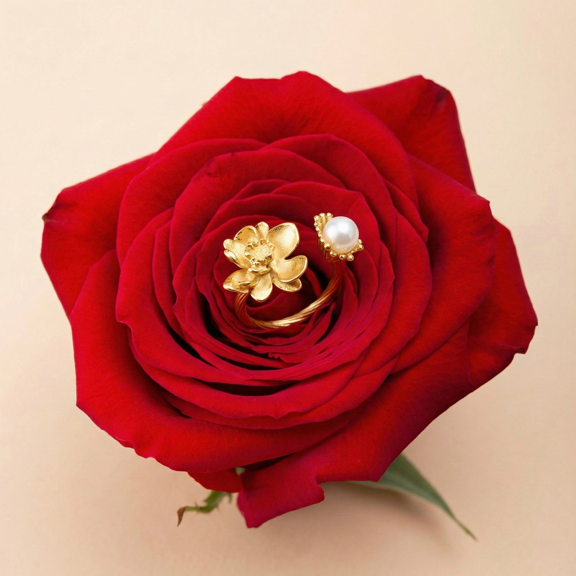 Gracefully elegant—our Pearl Floral Ring is a charming open-style design that features a delicate flower on one end and a luminous pearl on the other. A perfect blend of femininity and freshness.